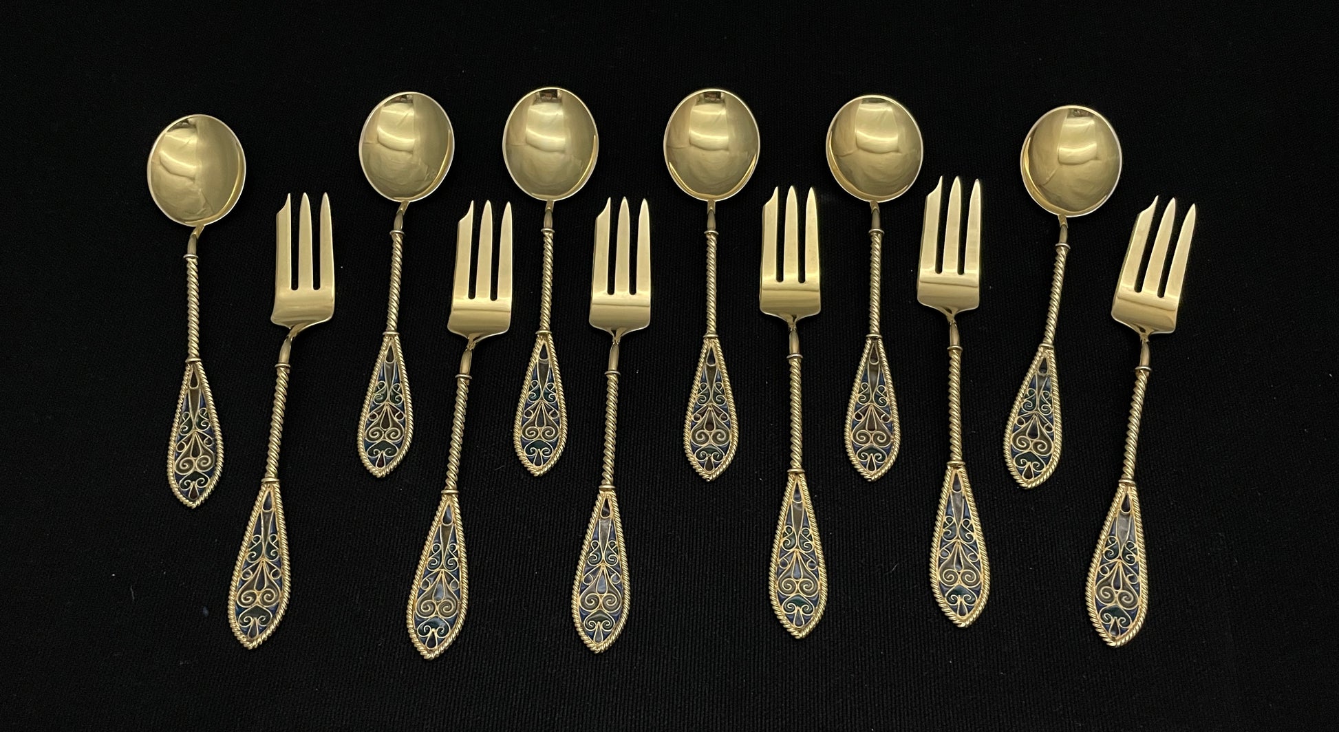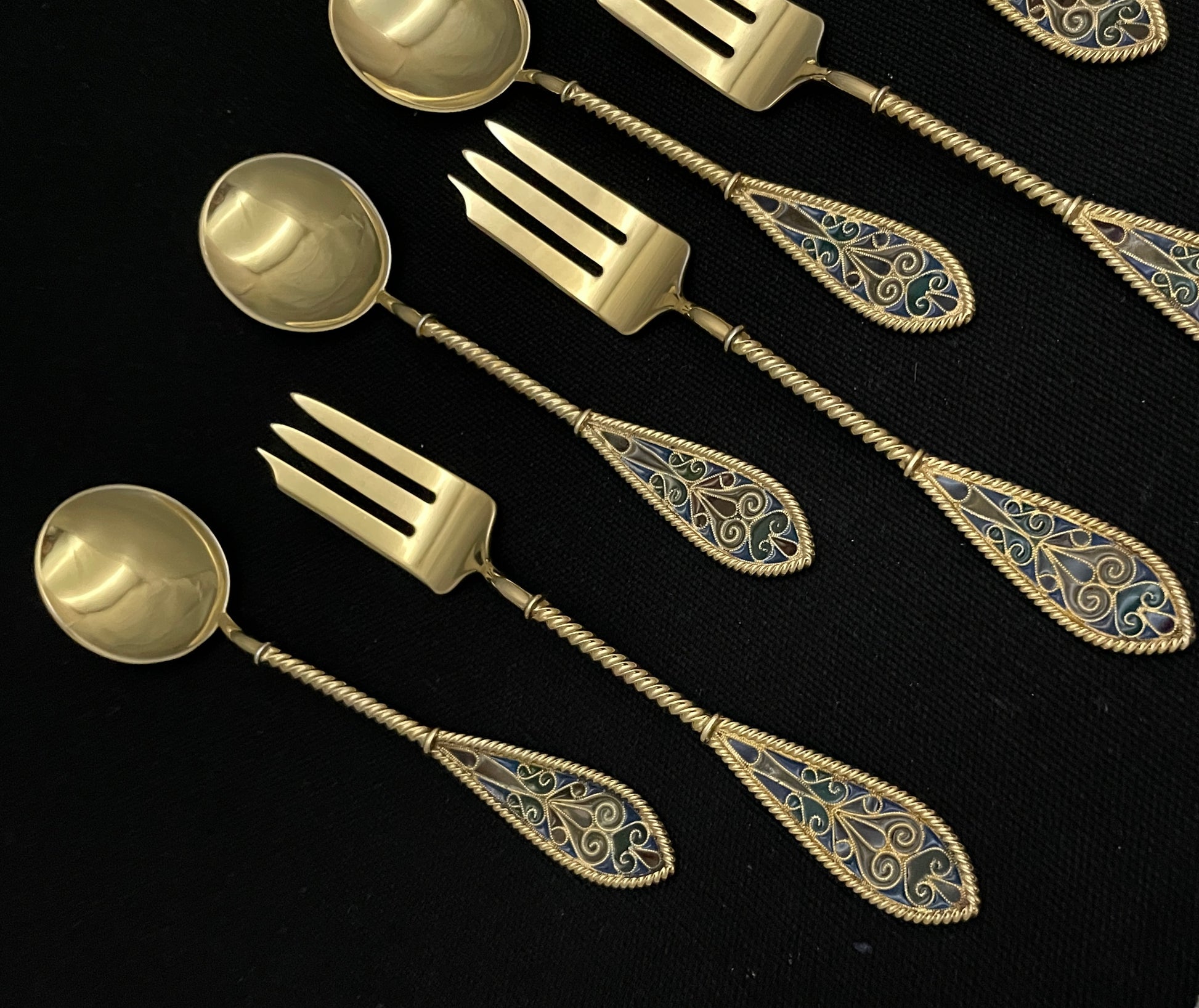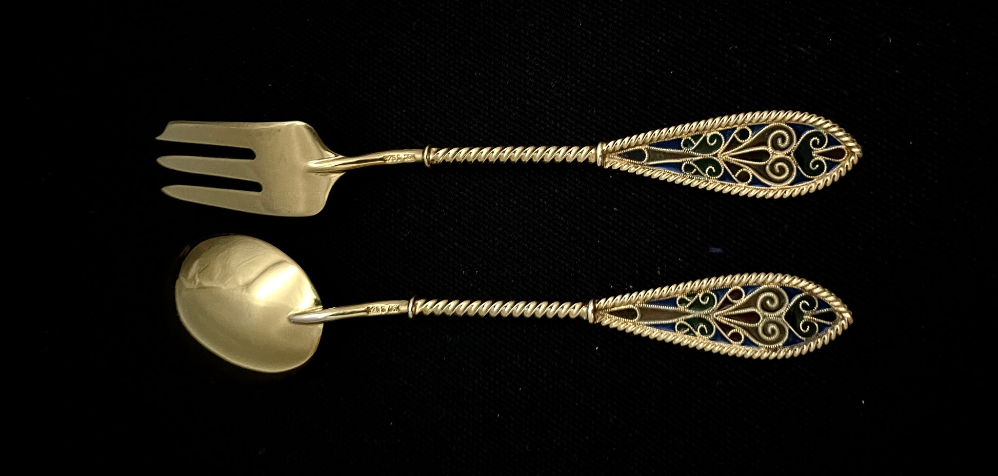 Kake gafler og dessert skjeer i forgylt sølv i 925s av den kjente norske juveleren og emaljekunstneren Johan G. Kjærland (JGK), spesielt hans arbeid med Plique-à-jour emalje, en teknikk som slipper lys gjennom emaljen (likt glassmaleri), ofte i vakre smykker som brosjer, populære rundt 1900-1920
